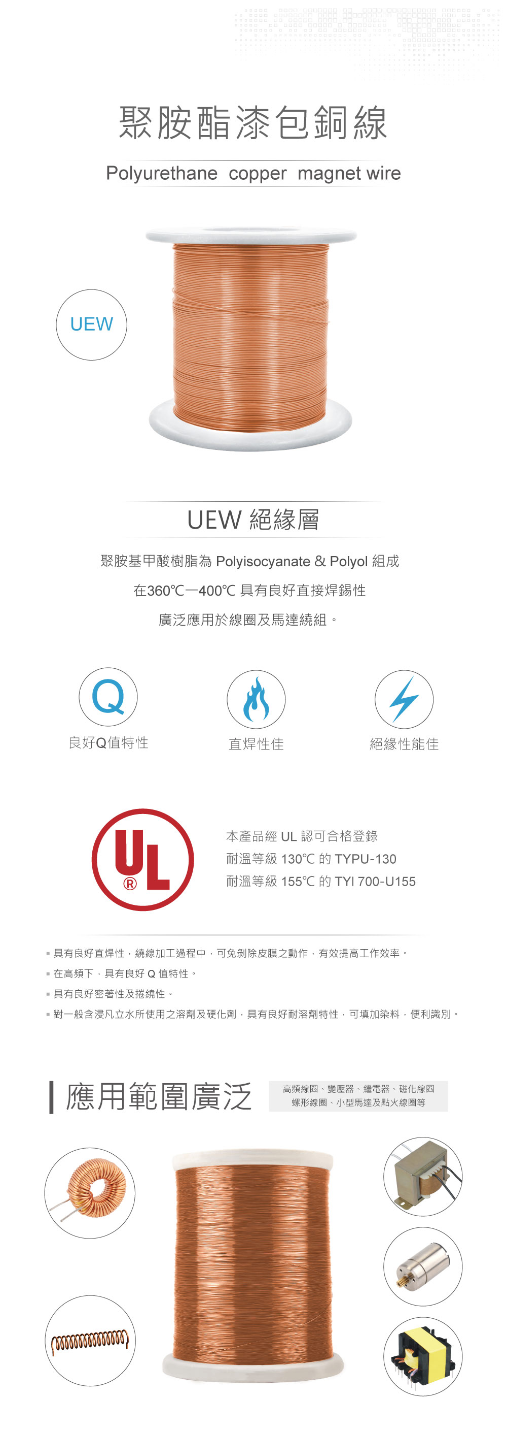 - ● 耐高溫 130 度,可直焊,2UEW(绝缘漆膜聚氨酯漆)厚.
