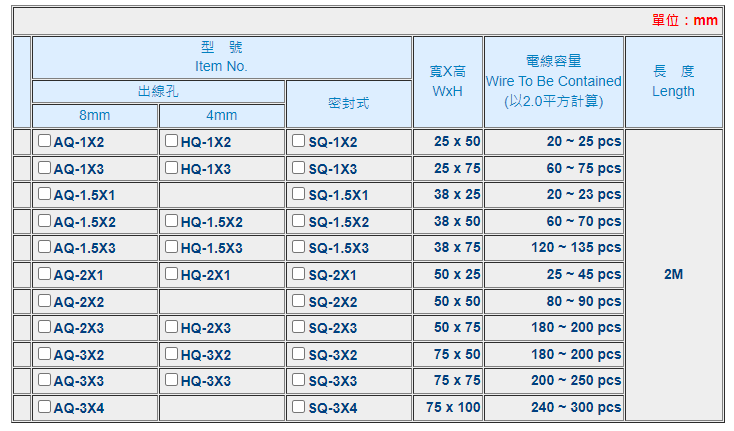 | 構造: | 由槽底及槽蓋兩部份組成,槽底兩側設出線孔,以組合後外部之寬、高為規格標準,UL測試溫度50℃。 |