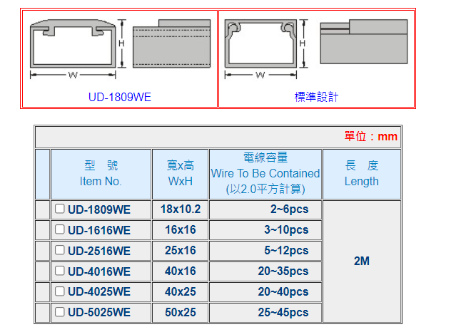 | 構造: | 由槽底及槽蓋兩部份組成,以組合後外部之寬、高為規格標準, UL測試溫度50℃。 |