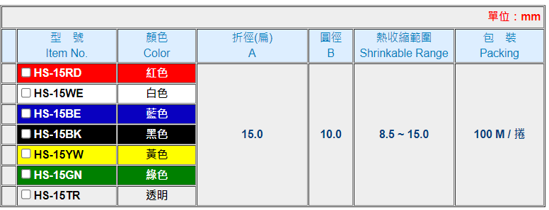 | 特性: | 收縮溫度100℃以上,內徑收縮率45~50%;縱向收縮率8~15%,可連續使用溫度-15 to 105℃,厚度0.08mm。 |