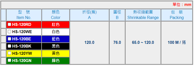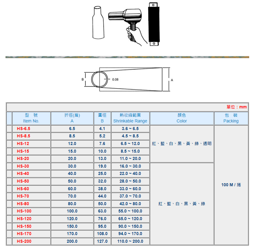 | 特性: | 收縮溫度100℃以上,內徑收縮率45~50%;縱向收縮率8~15%,可連續使用溫度-15 to 105℃,厚度0.08mm。 |