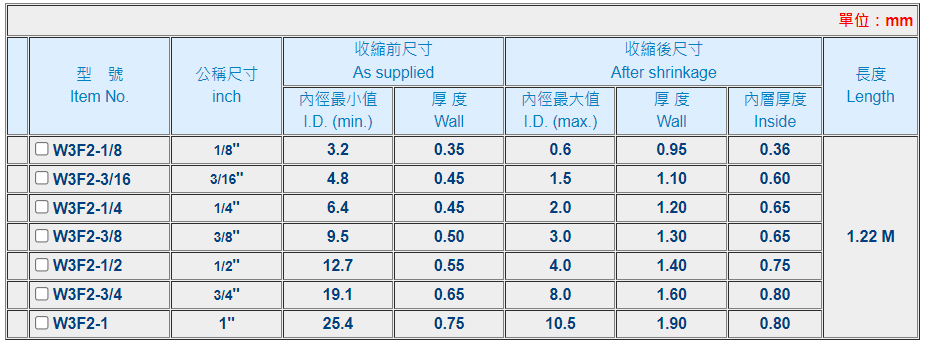 | 特性: | 收縮溫度110℃以上,內徑收縮率60%以上,縱向收縮最大15%,可連續使用溫度-55℃~125℃。 |