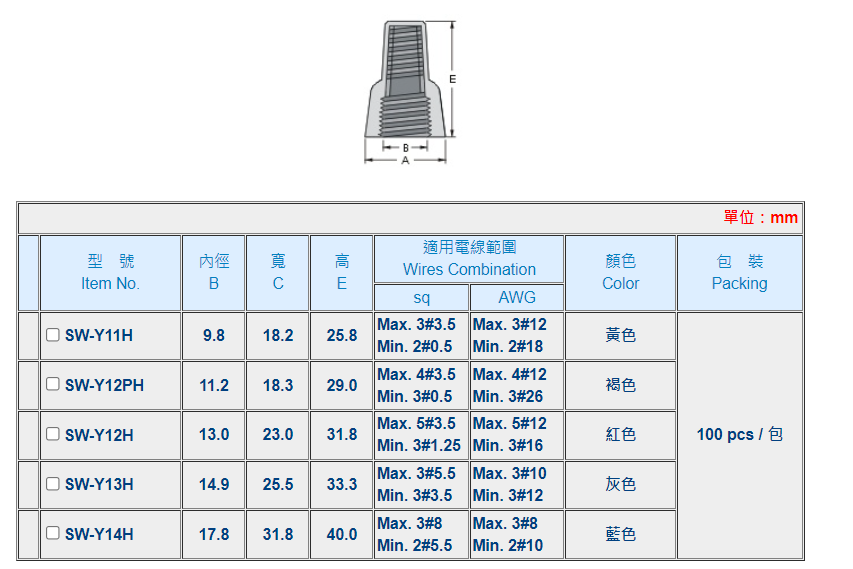 | 材質構造: | 採 PP 料製成,絕緣性良好,內附彈簧,適用於單蕊及較粗蕊之電線可耐溫至105℃,防火等級 94V-2。 |