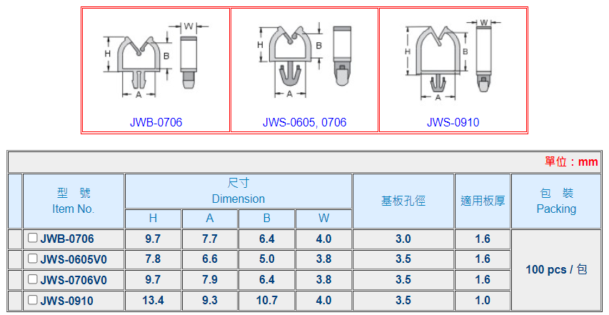 | 材質: | JWS-0605, JWS-0706為UL合格之NYLON 66(白色),防火等級 94V-0。 |