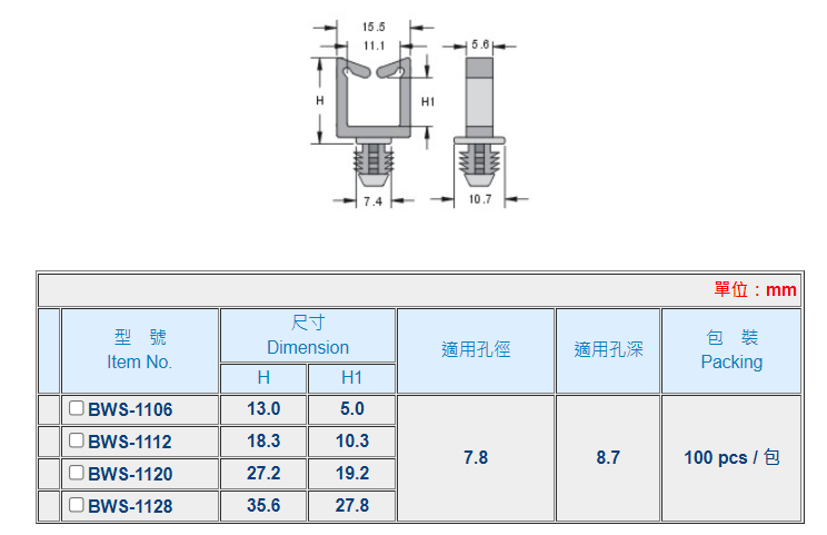 | 材質: | UL合格之 NYLON 66(本色),防火等級 94V-2。 |