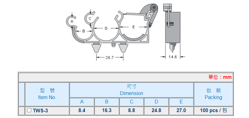 | 材質: | UL合格之NYLON 66(本色),防火等級 94V-2。 |