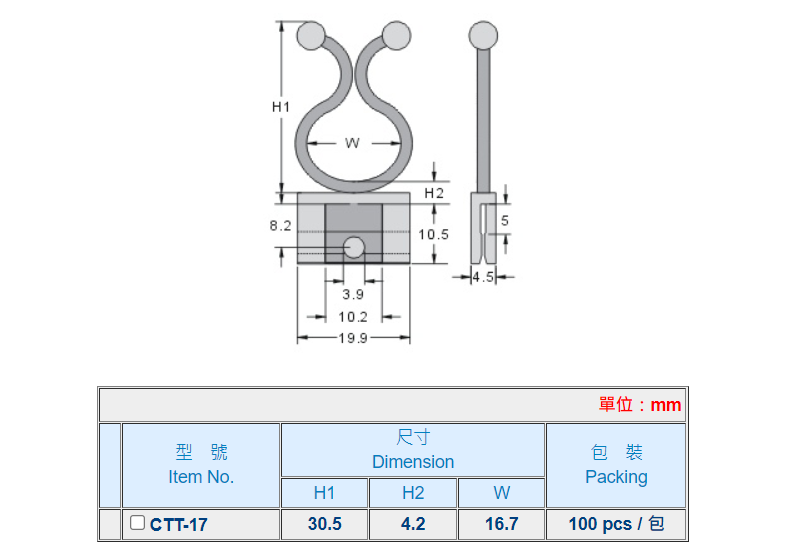 | 材質: | UL合格之NYLON 66(本色),防火等級 94V-2。 |