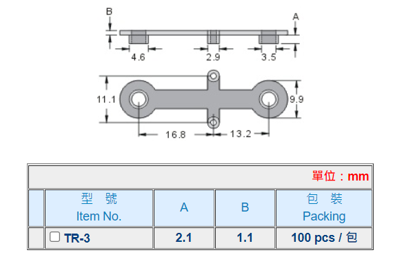 | 材質: | UL合格之 NYLON 66(本色),防火等級 94V-2。 |