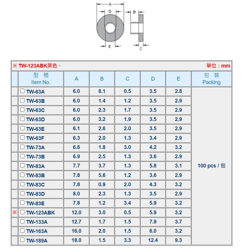 | 材質: | UL合格之 NYLON 66(本色),防火等級 94V-2。 |