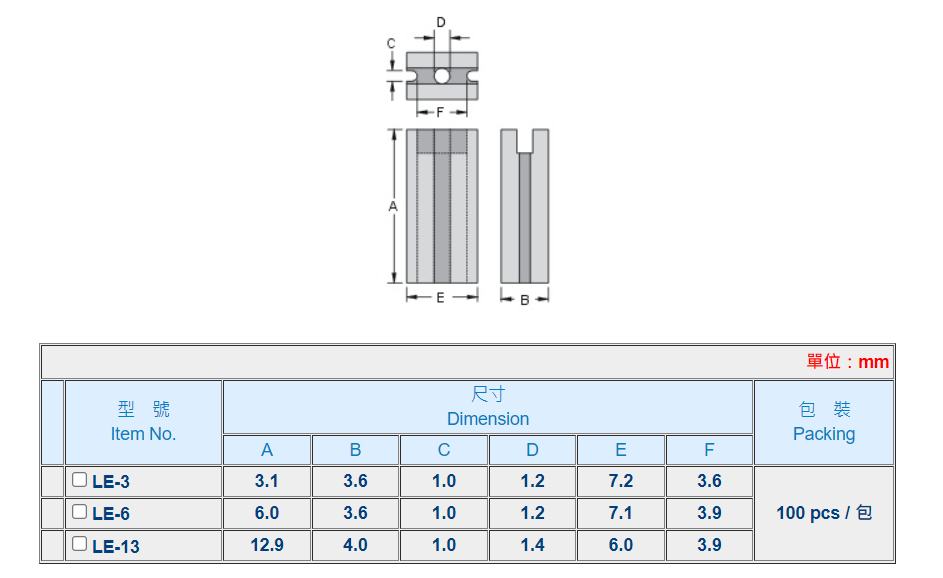 | 材質: | UL合格之 NYLON 66(本色),防火等級 94V-2。 |