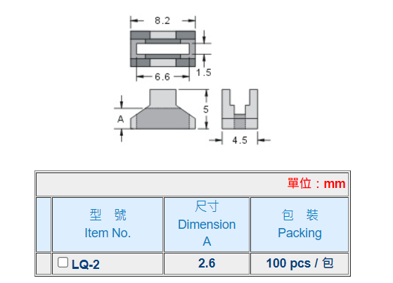 | 材質: | UL合格之 NYLON 66(本色),防火等級 94V-2。 |