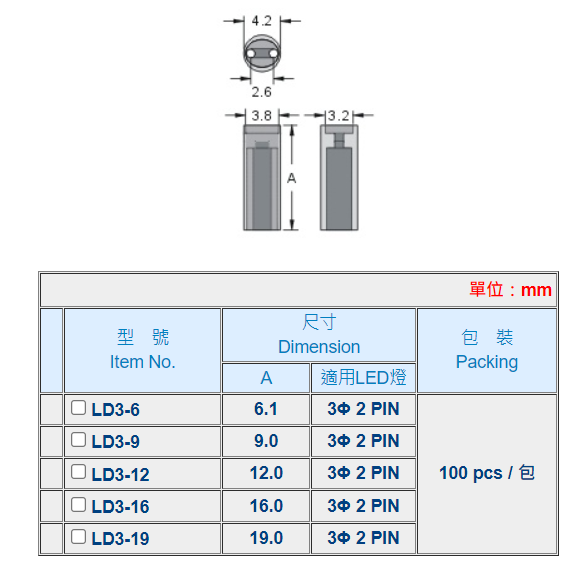 | 材質: | UL合格之 NYLON 66(本色),防火等級 94V-2。 |