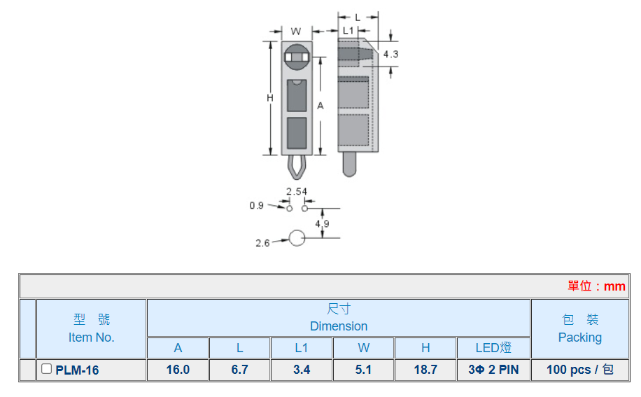 | 材質: | UL合格之 NYLON 66(本色),防火等級 94V-2。 |
