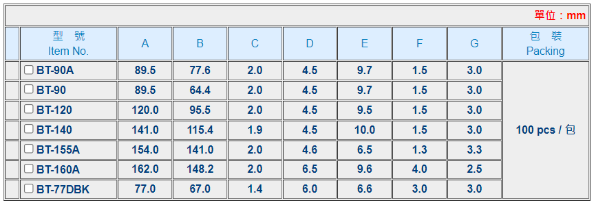 | ★ | BT-90A,BT-155A,BT-160A設有 2片插鞘可免用螺絲固定、直接插入即可。 |