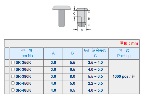 | 用法: | 先將基板及被固定板鑽孔,再將本產品塞入壓緊,即可使兩板相結合。 |