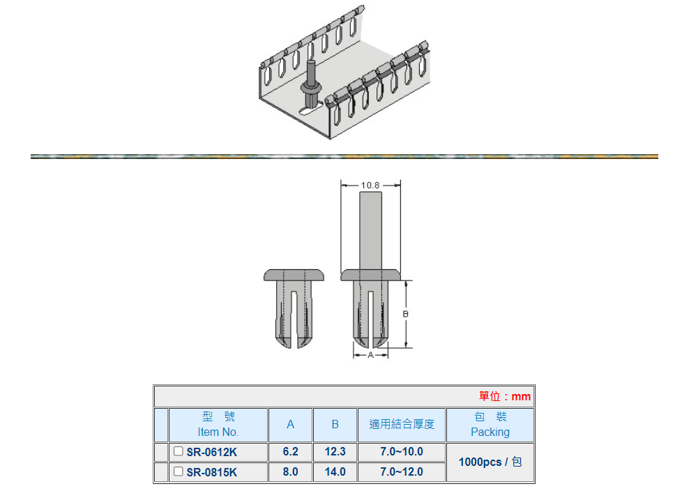 | 用法: | 先將基板及被固定板鑽孔,再將本產品塞入壓緊,即可使兩板相結合。 |