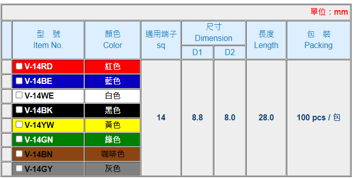 | 用途: | 適用於各種配電盤、機械中複雜配線之分色處理,使線路能一目了然。軟質彈性佳能適合於各種不同形狀的端子,使用時著脫容易。 |