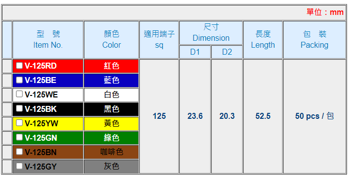 | 用途: | 適用於各種配電盤、機械中複雜配線之分色處理,使線路能一目了然。軟質彈性佳能適合於各種不同形狀的端子,使用時著脫容易。 |