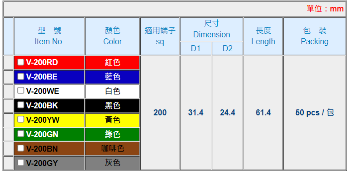 | 用途: | 適用於各種配電盤、機械中複雜配線之分色處理,使線路能一目了然。軟質彈性佳能適合於各種不同形狀的端子,使用時著脫容易。 |