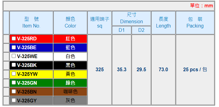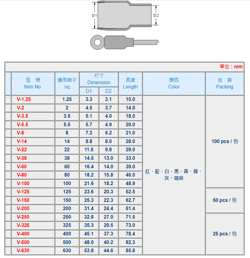 | 用途: | 適用於各種配電盤、機械中複雜配線之分色處理,使線路能一目了然。軟質彈性佳能適合於各種不同形狀的端子,使用時著脫容易。 |