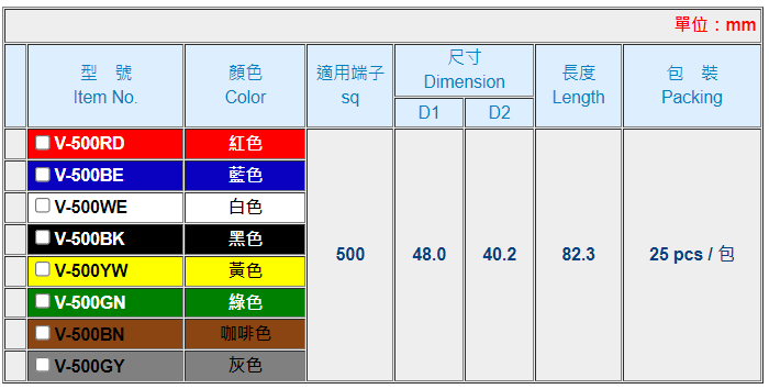 | 用途: | 適用於各種配電盤、機械中複雜配線之分色處理,使線路能一目了然。軟質彈性佳能適合於各種不同形狀的端子,使用時著脫容易。 |