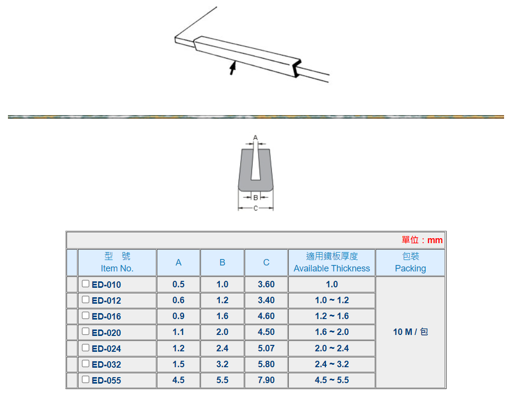 | 用法: | 依據鐵板、PC板斷面長度大小,截取所需之長度,直接套入斷面即可。 |