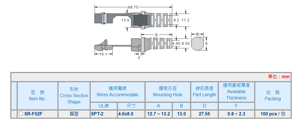 | 材質: | UL合格之NYLON 66(黑色)防火等級 94V-2。 |