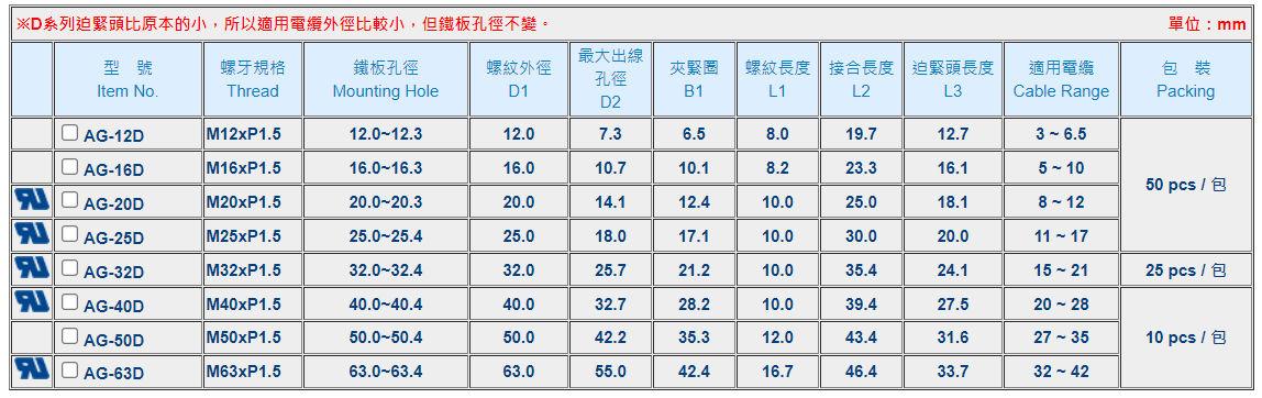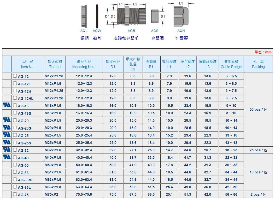 | ※ | 若分開訂購各零件時,請在型號後面加上各代號:螺帽(L) 墊片(W) 本體(B) 夾緊圈(S) 迫緊頭(N) 例:訂購AG-12螺帽,型號為AGL-12。 | |