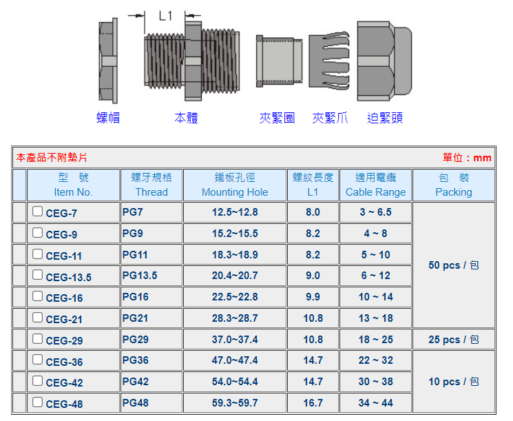 | ※ | 若分開訂購各零件時,請在型號後面加上各代號:螺帽(L) 墊片(W) 本體(B) 夾緊圈(S) 迫緊頭(N)例:訂購CEG-7螺帽,型號為CEGL-7。 |