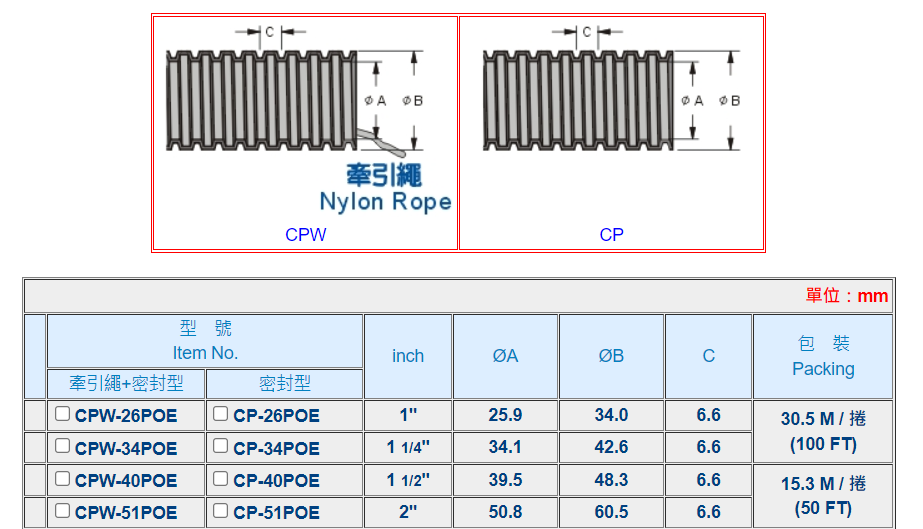 | 材質: | 浪管為南亞PVC (橘色),防火等級94V-0;牽引繩為Nylon。 |