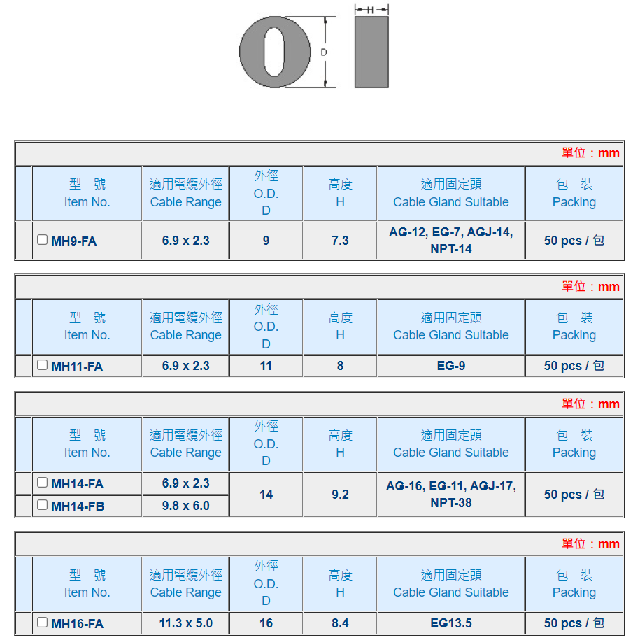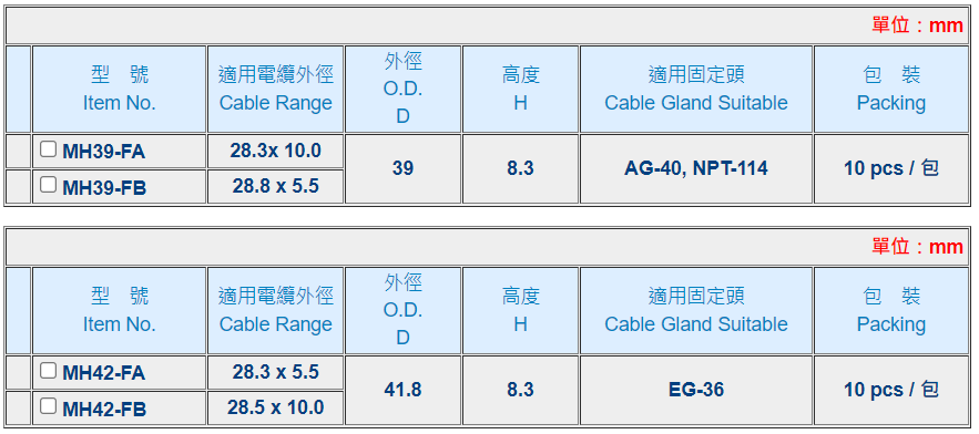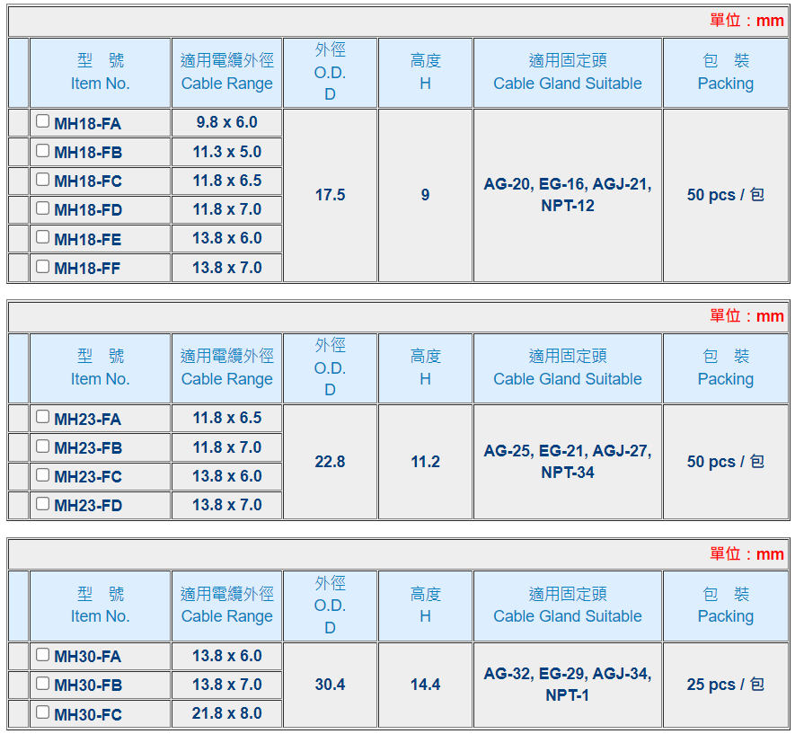 | MH9-FA搭配AG-12固定頭,則型號為AG-12-FA;MH23-FD搭配NPT-34固定頭,則型號為NPT-34-FD;MH39-FB搭配EG-36固定頭,則型號為EG-36-FB。 | |