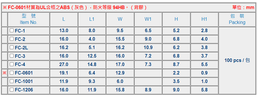 | ※ | FC-0601材質為UL合格之ABS(灰色),防火等級 94HB,底座背膠。 |