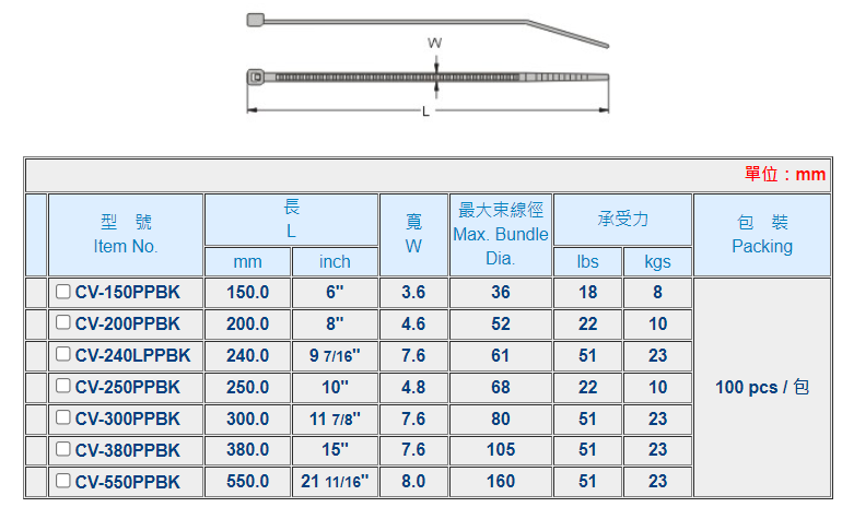 | 用途: | 適合化工產業之管線固定用,可提升紮線帶於化學性(酸鹼)環境之耐用度。 |