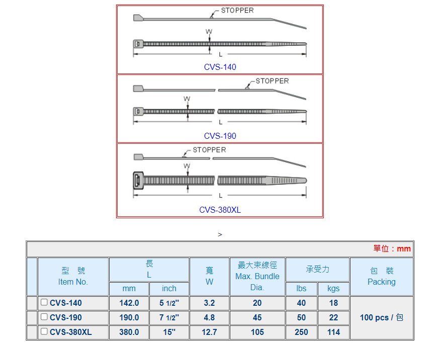 | 特點: | 帶身附阻擋點,確保紮線帶之最小使用範圍。 |