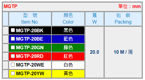 | 材質: | 公面PP,母面NYLON。 MGT系列:厚型母面,MGTP系列:薄型母面。 |