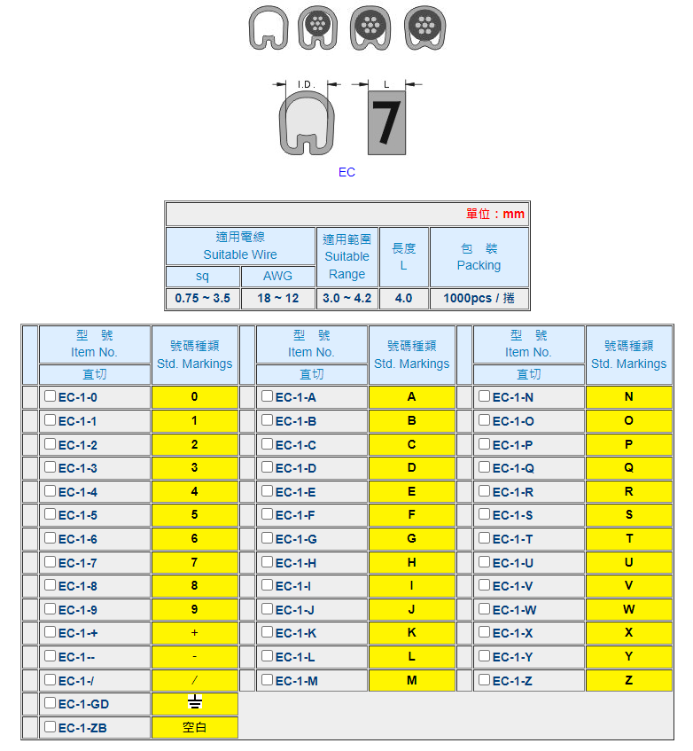 | 構造: | EC型標誌內部成凹型,具有彈性,內徑能隨電線大小而伸縮。 | |