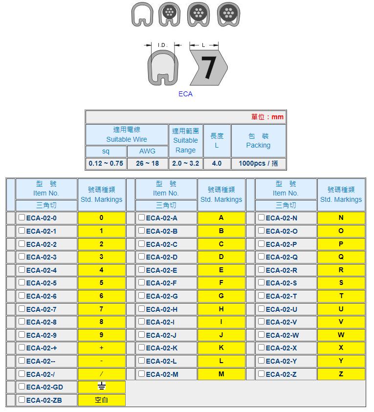 | 構造: | EC型標誌內部成凹型,具有彈性,內徑能隨電線大小而伸縮。 | |