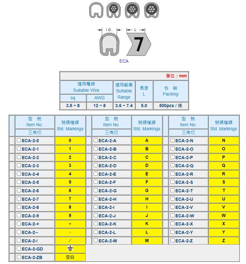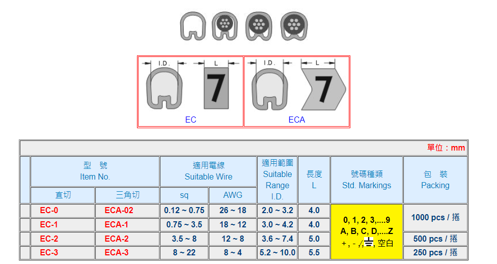 | 構造: | EC型標誌內部成凹型,具有彈性,內徑能隨電線大小而伸縮。 | |