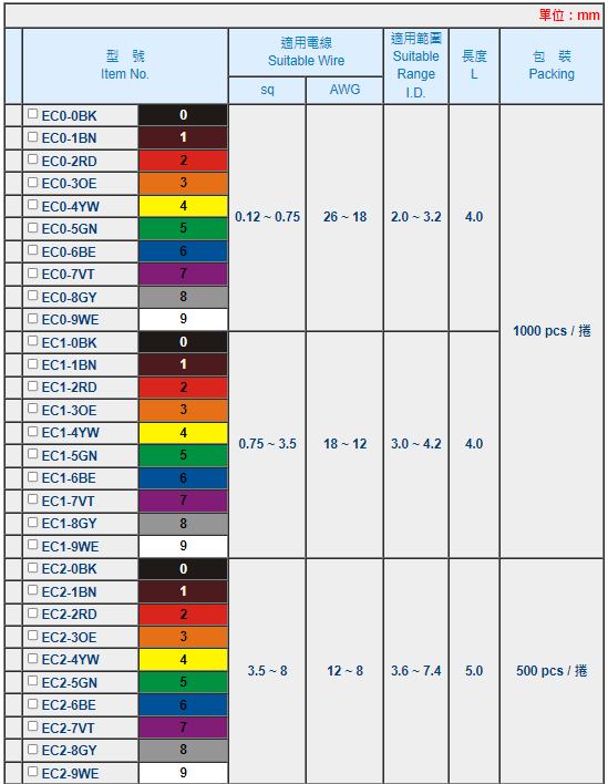| 2.一種規格的 EC型配線標誌即可適合多種電線的使用。 | ||