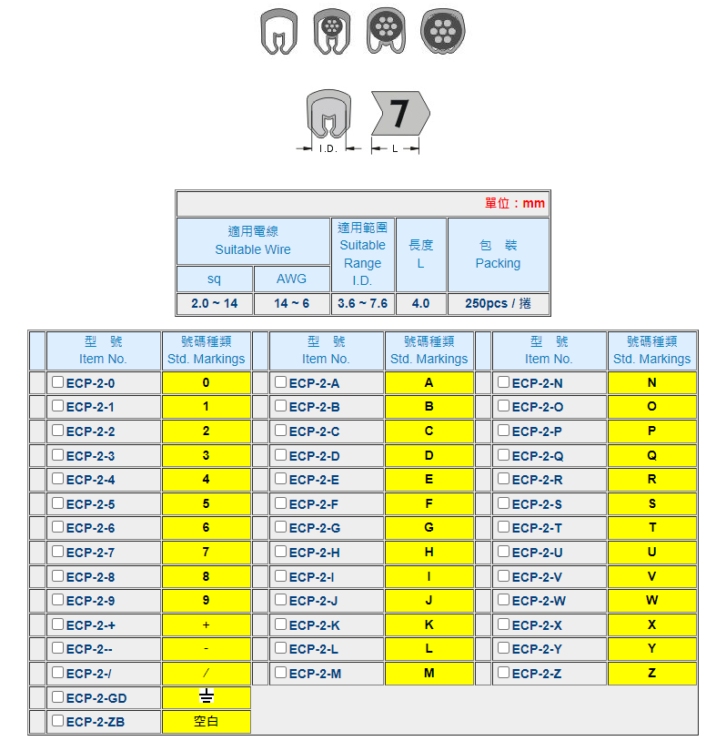| 構造: | ECP型標誌內部呈凹型,具有彈性,內徑能隨電線大小而伸縮。 | |