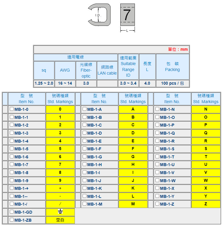 | 優點: | NYLON 6材質彈性大,一種規格可使用多種尺寸電線,且具有不易變形、不易脫落的特點,印字漂亮、不易褪色。內部兩側設有止滑點不易個別翻轉,保持編碼的一致性,編碼顯示效果佳。 |