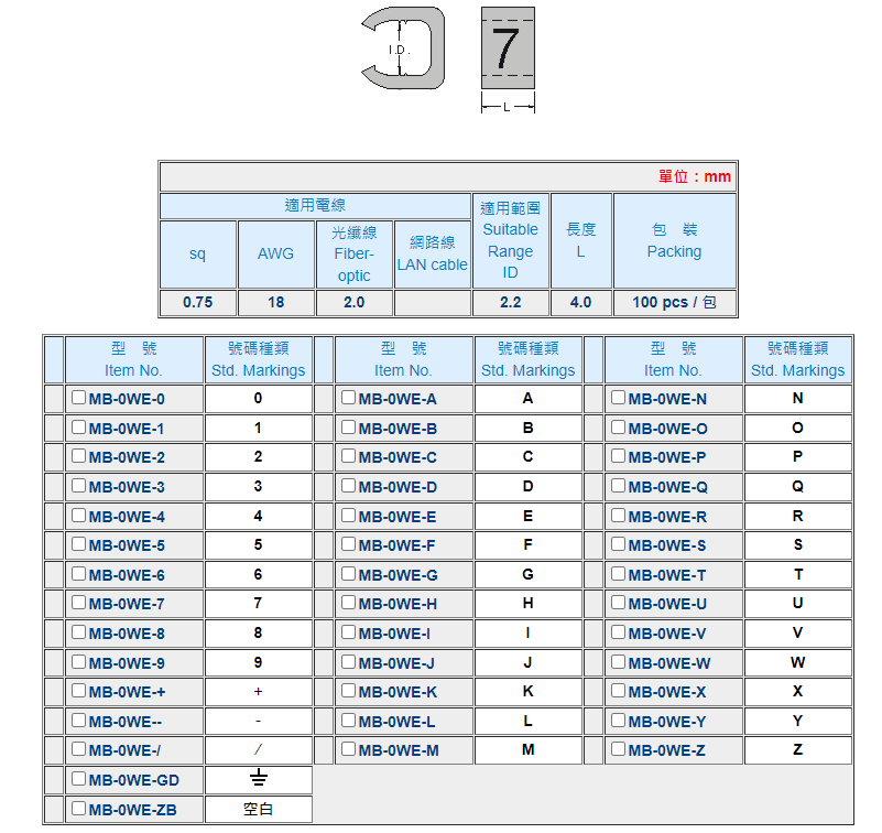 | 優點: | NYLON 6材質彈性大,一種規格可使用多種尺寸電線,且具有不易變形、不易脫落的特點,印字漂亮、不易褪色。內部兩側設有止滑點不易個別翻轉,保持編碼的一致性,編碼顯示效果佳。 |