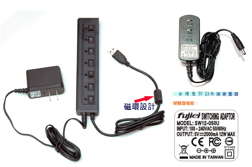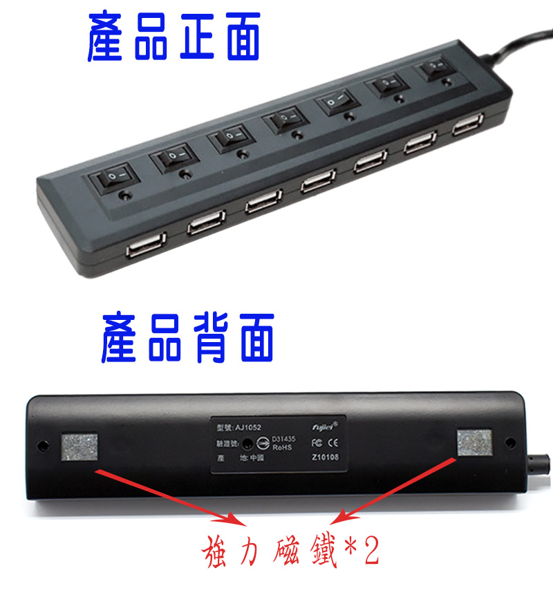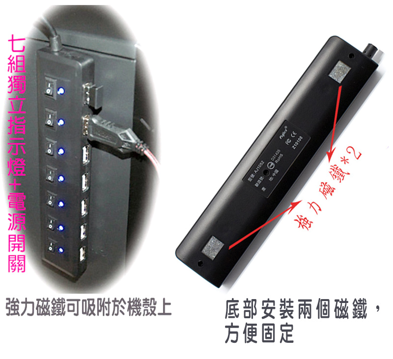 7 port HUB帶開關+2A變壓器 +強力磁鐵 AJ1052
