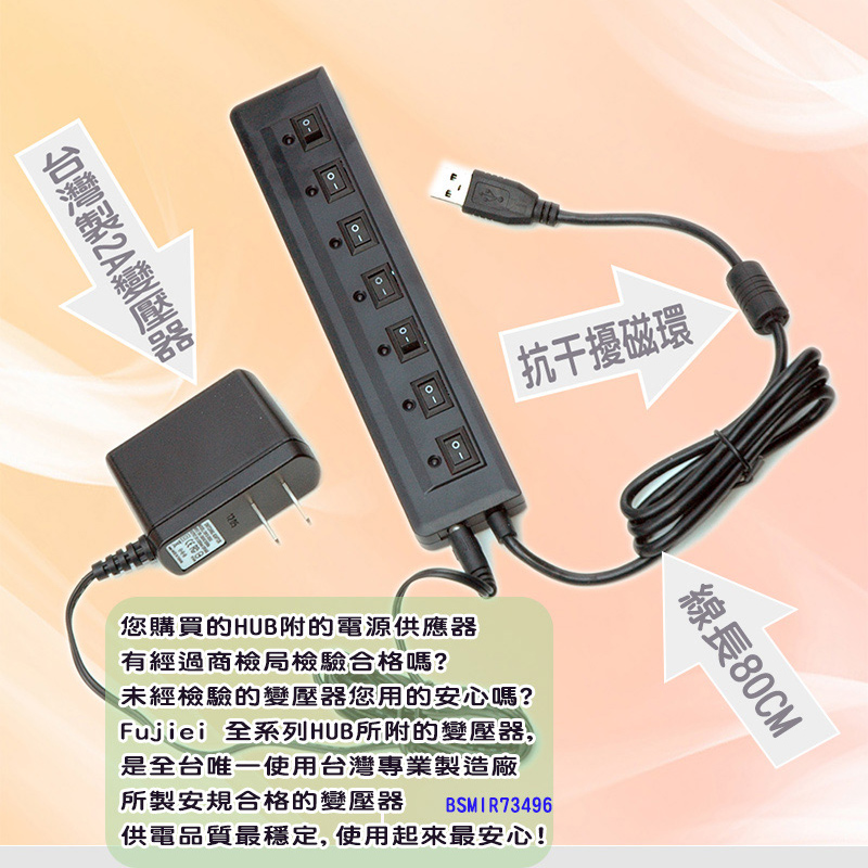 9.HUB及變壓器皆通過安規認證 : HUB符合台灣BSMI認證D31435,台灣製變壓器BSMI認證R73496