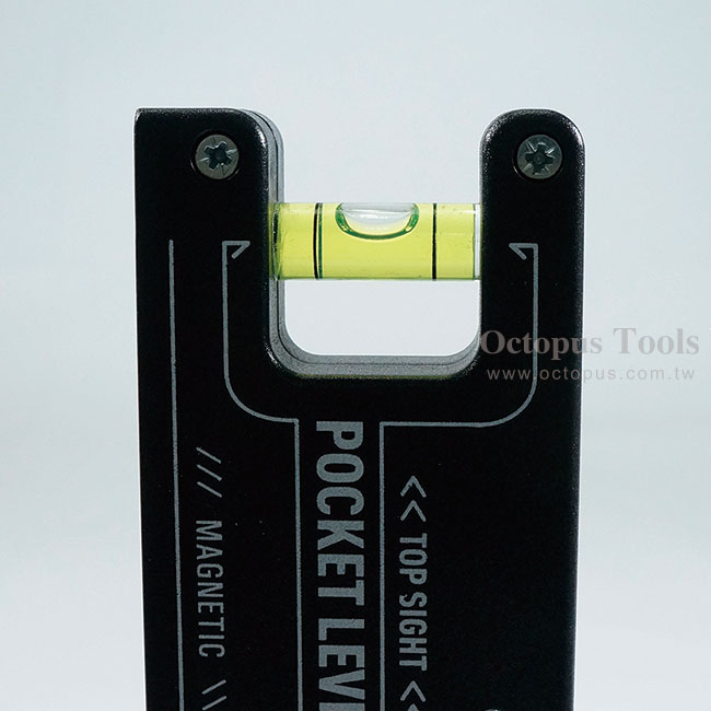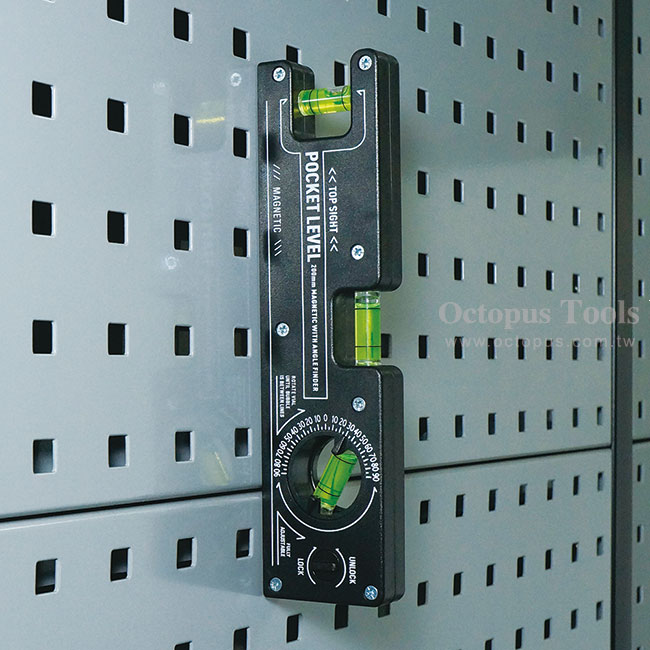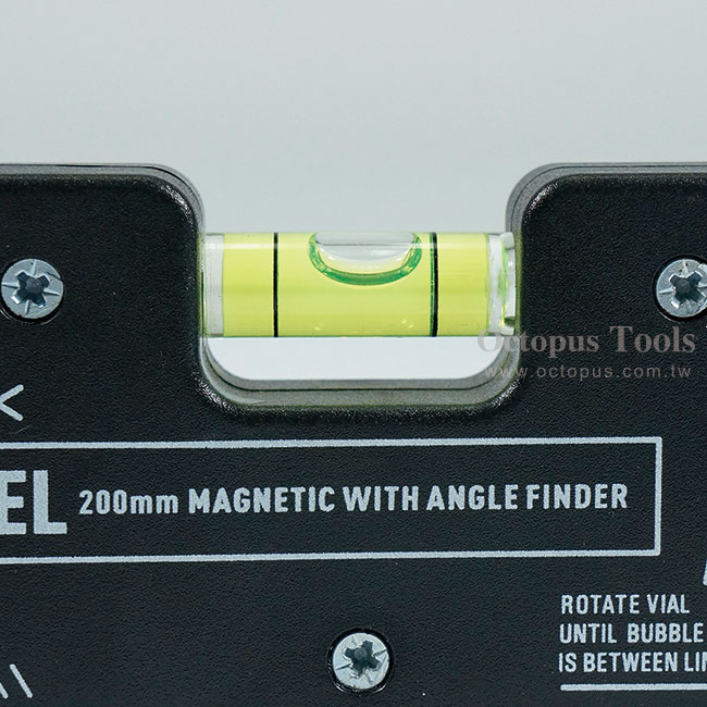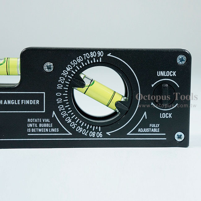 ◆ 共有三個水平泡儀,分別為0°,90°,與可調整角度的水平泡儀,角度調整後更可透過旋鈕鎖定,避免因移動造成測量失準。