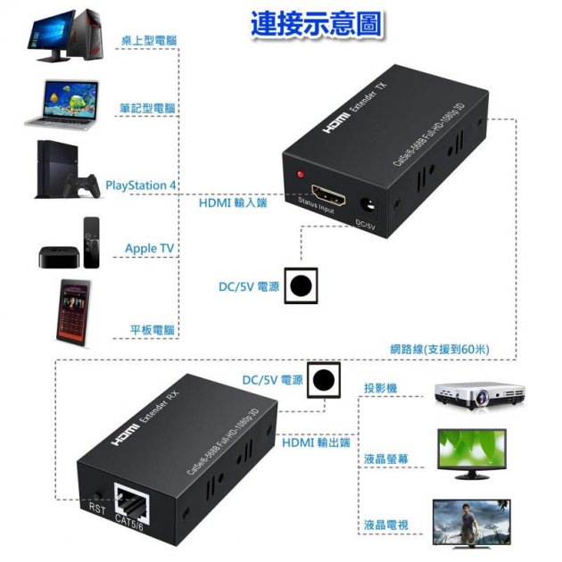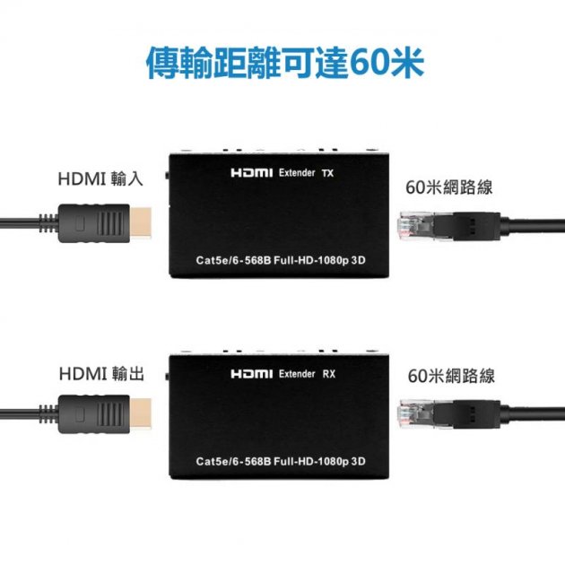 使用單根網線遠距離傳輸HDMI信號,延長距離取決網路線材,最長可達60M