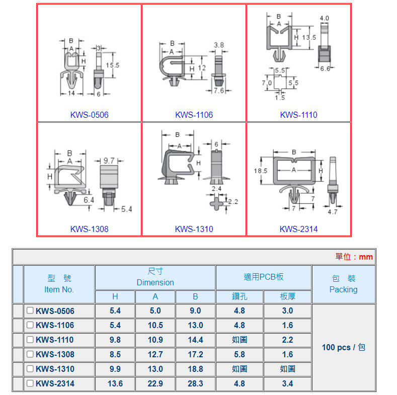 | 材質: | UL合格之 NYLON 66(本色),防火等級 94V-2。 |