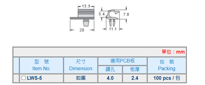 | 材質: | UL合格之NYLON 66(本色),防火等級 94V-2。 |