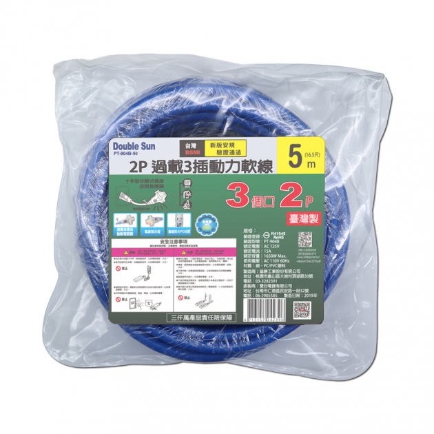 (PT-904B-5)2P過載3插動力軟線附燈 5米