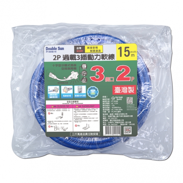 (PT-904B-15)2P過載3插動力軟線附燈 15米